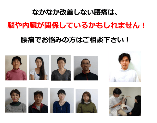 脳や内臓の変調によって発生する腰痛は、痛みのある部分を調整してもなかなか改善しないことも多く、脳や内臓へのアプローチが大切です。